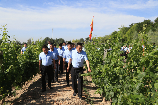 為了深入落實習(xí)近平總書記對寧夏賀蘭山東麓葡萄酒產(chǎn)業(yè)發(fā)展的指示精神,銀川城建集團黨委書記、董事長雷光新帶領(lǐng)全體黨員走進賀蘭山東麓新牛酒莊葡萄種植園考察,大力促進葡萄酒事業(yè)發(fā)展。