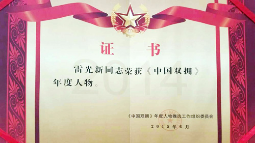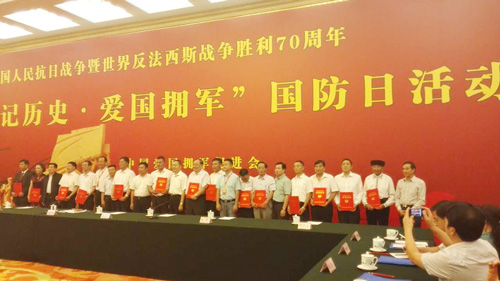 7月10日,雷光新董事長(zhǎng)在人民大會(huì)堂參加“紀(jì)念中國(guó)人民抗日戰(zhàn)爭(zhēng)暨世界反法西斯戰(zhàn)爭(zhēng)勝利70周年,銘記歷史·愛(ài)國(guó)擁軍”國(guó)防日活動(dòng),并同全國(guó)評(píng)選的十五位中國(guó)雙擁年度人物上臺(tái)領(lǐng)獎(jiǎng)。
